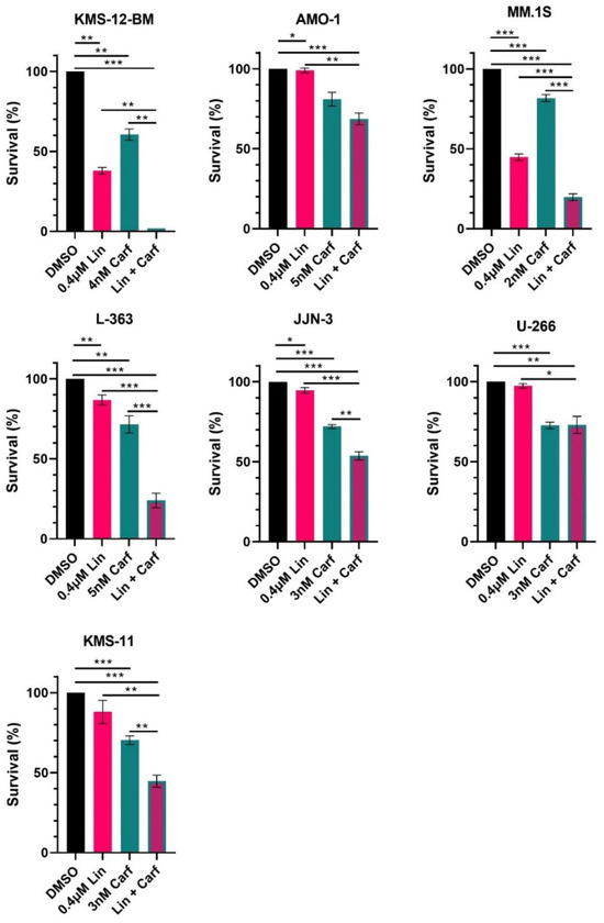Treatment of 7 HMCLs with linsitinib (Lin) alone and in combination with carfilzomib (Carf) for 72 h. Effect on survival was determined by annexin-V/PI staining in three independent experiments except for KMS-12-BM (two experiments). Data shown is survival relative to DMSO control (mean ± SEM). Statistical test was a two-tailed unpaired t-test. * for p < 0.05; ** for p < 0.01; and *** for p < 0.001.