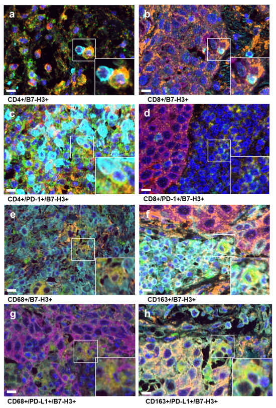 Results of multiplex immunohistochemistry. (a–d) B7-H3: orange, PD-L1: red, CD4: yellow–green, CD8: light blue, PD-1: yellow, CK: pink. (e–h) B7-H3: orange, PD-L1: red, CD163: yellow–green, HLA: light blue, CD68: yellow. (Asakawa et al.).