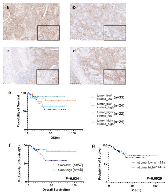 Single staining of B7-H3 and Kaplan–Meier curve stratified by B7-H3 expression. (a–d) Single staining of B7-H3. (a) High tumor B7-H3 expression. (b) Low tumor B7-H3 expression. (c) Low stromal B7-H3 expression. (d) High stromal B7-H3 expression. (e–g) Kaplan–Meier curve based on tumor and/or stromal B7-H3 expression. (Asakawa et al.).