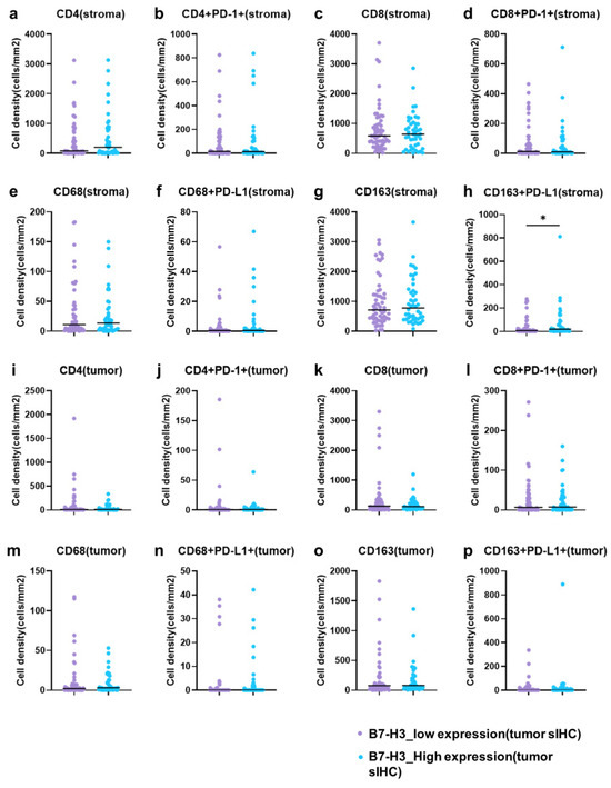 Relationship between tumor B7-H3 expression and cell phenotypes. (a) Stromal CD4+ single-positive cells. (b) Stromal CD4+PD-1+ double-positive cells. (c) Stromal CD8+ single-positive cells. (d) Stromal CD8+PD-1+ double-positive cells. (e) Stromal CD68+ single-positive cells. (f) Stromal CD68+PD-L1+ double-positive cells. (g) Stromal CD163+ single-positive cells. (h) Stromal CD163+PD-L1+ double-positive cells. (i) Tumor CD4+ single-positive cells. (j) Tumor CD4+PD-1+ double-positive cells. (k) Tumor CD8+ single-positive cells. (l) Tumor CD8+PD-1+ double-positive cells. (m) Tumor CD68+ single-positive cells. (n) Tumor CD68+PD-L1+ double-positive cells. (o) Tumor CD163+ single-positive cells. (p) Tumor CD163+PD-L1+ double-positive cells. The horizontal bars indicate the median, and the vertical axis of the graph represents the cell density. (Asakawa et al.). * p < 0.1.
