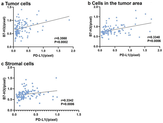Finally, we examined the correlation between membrane B7-H3 and PD-L1 expression in tumor and stromal cells by examining B7-H3 expression or PD-L1 expression levels per cell membrane pixel with slides from all groups (Figure 4). B7-H3+ expression correlated positively with PD-L1 expression in tumor and other cells in the TME, including intratumoral TILs and TAMs (Figure 4a,b). Additionally, we observed a positive correlation between membrane B7-H3 and PD-L1 expression in stromal cells (Figure 4c).