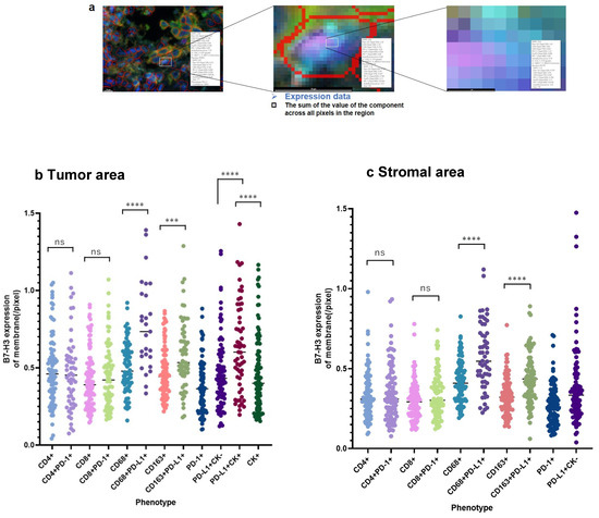 Expression of B7-H3 at the cell membrane. (a) A scheme for calculating B7-H3 expression levels per cell membrane pixel. (b) Membrane B7-H3 expression for each phenotype cell in the tumor area. The vertical axis presents B7-H3 expression per cell membrane pixel. (c) The B7-H3 expression of the cell membrane for each phenotype cell in the stromal area. The vertical axis presents B7-H3 expression per cell membrane pixel. *** p < 0.001; **** p < 0.0001; ns: not significant.