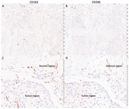 CD163 and CD206 expression was successfully assessed in 220 and 211 cases, respectively (Figure 1 and Supplementary Figure S2). Overall, the median stromal density for CD163 (sCD163) and CD206 (sCD206) TAMs were 354.1 cells/mm2 (mean 538.7, range 2.3–3398.0 cells/mm2) and 303.2 cells/mm2 (mean 409.2, range 9.3–2707.8 cells/mm2), respectively. The median tumoral density for CD163 (tCD163) and CD206 (tCD206) TAM were 210.8 cells/mm2 (mean 373.4, range 1.2–4037.4 cells/mm2) and 111.6 cells/mm2 (mean 177.0, range 2.9–2221.6 cells/mm2), respectively (Supplementary Figure S3). Cases were categorized into high- and low-TAM subgroups based on the median density value. sCD163 and tCD163 TAMs showed a stronger association with each other than CD206 TAMs (rs = 0.718 vs. 0.534). CD163 and CD206 TAMs only correlated with each other moderately in the stroma or tumor nest (rs = 0.493 and 0.483, respectively). When categorized as high and low subgroups, there were more sCD206-high, tCD206-low cases (p = 0.024), but not for CD163. A trend of more tCD163-high than tCD206-high was found (p = 0.066) (Supplementary Table S3 and Supplementary Figure S3).