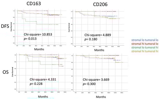 Kaplan–Meier analysis according to grouping based on TAM density in both stromal and tumor compartments. Patients were stratified based on the density of two TAMs in different compartments. Patients with stromal-low, tumoral-high CD163 TAM showed significantly worse DFS. Difference in survival curves were assessed with a log-rank test.