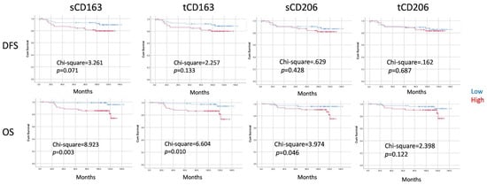 In line with their correlations, the clinico-pathological associations of the CD163 and CD206 TAM density shared some similarities. Regardless of their locations, both TAMs showed significant associations with a larger tumor size and high TIL level (p ≤ 0.016). The stromal density of both were associated with the presence of necrosis, LVI, high Ki67, HER2 positivity, and PDL1+ immune cells (p ≤ 0.032). However, tCD163 showed associations with a higher grade, high Ki67, HER2 positivity, and PDL1+ immune cells (p ≤ 0.038), but not for tCD206. Additionally, sCD163 was associated with a higher grade, ER negativity, PR negativity, P63 positivity and a differential distribution in molecular subtypes (p ≤ 0.012), but not for sCD206. The sCD163 distribution was found to be the highest in HER2-OE (80.9%), followed by TNBC (64.0%), luminal B (50.4%) and luminal A (30.6%). Only sCD206 showed a positive association with nodal metastasis (p = 0.033). The tCD206 showed associations with ER negativity, PR negativity, and CK14 (p ≤ 0.022) positivity, but not sCD206 (Table 1 and Supplementary Figure S4).