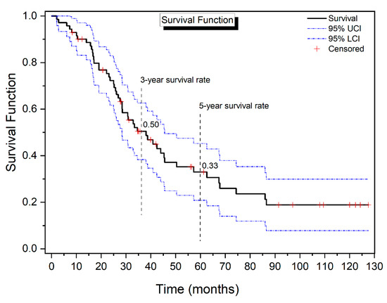 The Kaplan–Meier survival analysis yielded an estimated mean survival duration of 52.65 ± 5.42 months for the entire patient cohort following the applied treatment, with a 95% confidence interval ranging from 42.03 to 63.28 months. The quartile estimations indicate the fact that 25% of patients had succumbed by the 23-month mark, while the median time to death for 50% of the cohort was observed at 38 months, and 75% had reached this event by 74 months. The analysis also delineated the survival probabilities at specified time points, revealing 3-year and 5-year survival rates at 0.50 and 0.33, respectively (Figure 2, Table 3).