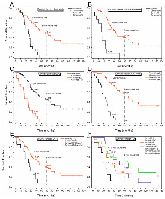 Figure 3. Survival curves with 3-year and 5-year survival rates determined for the patient cohort: (A) subjected to the radical (R, red line) or non-radical (N, black line) primary surgery, (B) platinum sensitive (N, red line) and resistant (Y, black line), (C) according to ECOG performance status scale (0—the black line, 1 and 2—the red line), (D) according to AGO score (negative—the black line, positive—the red line); (E) according to the CCR index (CC0—the red line, CC1 and higher—the black line) and (F) regarding PCI (0–4 the green line, 5–9 the red line, 10–14 the blue line, 15 and above the black line). Observations assigned a + were right-censored.