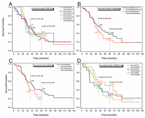 Figure 4. Survival curves for the CRS time (A), cytostatic (B), surgery method (C) and HIPEC time (D). Observations assigned a + were right-censored.