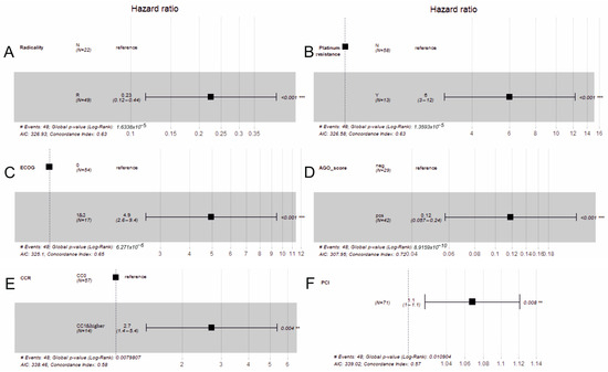 Figure 5. The forest plots of the hazard ratios (HRs) determined for the radicalness (A), Platinum resistance (B), ECOG (C), AGO score (D), CCR (E) and PCI (F) with the corresponding statistics: Akaike information criterion (AIC), concordance index (C-index) and p-value. **—p < 0.05, ***—p < 0.001.