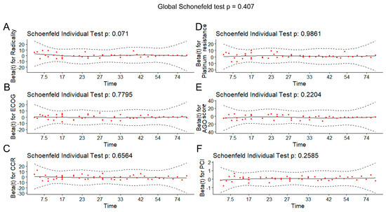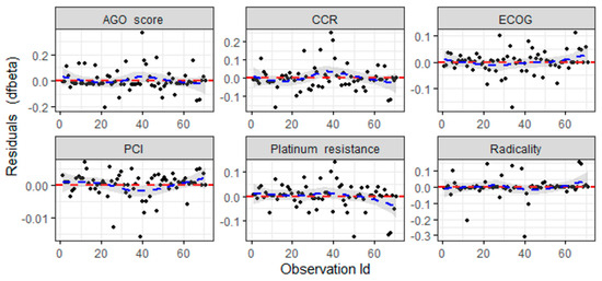 Univariate and multivariable Cox proportional hazard (PH) models were used to investigate the prognostic factors, which allowed for identifying the individual and combined impact of various predictors on the survival time. The existence of interactions between the variables and their effects over time was examined, providing insights into how these variables might influence each other and the OS outcomes. The Cox PH assumption, which requires that the hazard ratios between groups remain constant over time, was assessed using the scaled Schoenfeld residuals to ensure the validity of the model. Influential observations were checked with the dfBETA, which measures the change in the estimated regression coefficients when the model is fitted using all the observations versus when we fit the model leaving out one observation at a time according to Equation (2):
