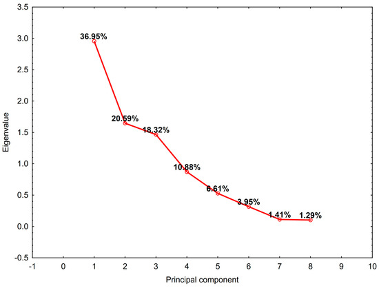 For the analysis, uncorrelated data were chosen and standardized. Active cases were those marked as uncensored. The selection of the ideal number of variables was determined using scree plot (Figure 8) and the Kaiser–Guttman criterion, indicating that principal components with eigenvalues exceeding one and accounting for a minimum of 75% of the overall variability are significant. In this manner, the principal components were reduced to three (PC1, PC2, and PC3), with 76% of the overall variance explained.