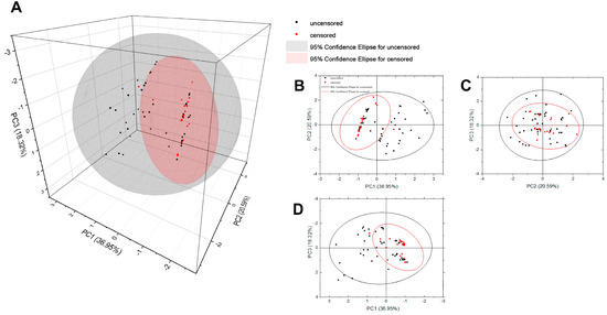 Figure 9. The projection of active (uncensored, black dots) and additional (censored, red dots) cases with 95% confidence ellipses in a new space created by (A) three components PC1, PC2 and PC3, (B) components 1 (PC1) and 2 (PC2), (C) components 2 (PC2) and 3 (PC3), and (D) components 1 (PC1) and 3 (PC3).