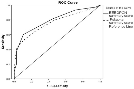 The basic parameters of an ROC analysis for the diagnostic accuracy of EEBGPCN and Fukuoka summary scores in HGD/IC (vs. LGD) patients’ status predictions.