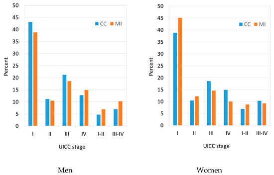 In the 854 patients for which the UICC stage was reported, the stage distribution for males and females was as follows: stage I—43.1% and 50.8%, stage II—11.2% and 12.0%, stage I/II—4.7% and 4.5%, stage III—21.2% and 17.9%, stage IV—12.8% and 8.0%, and stage III/IV—7.0% and 6.8%, respectively. Even after multiple imputation, men had a less favorable UICC stage distribution than women (Figure 1).