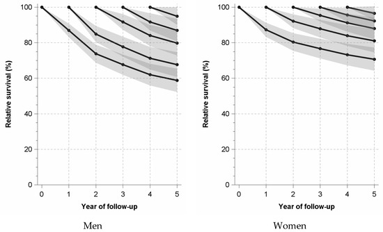 Unconditional relative survival, which is determined from the time of diagnosis, shows the sharpest drop of relative survival probability for both sexes within the first year after diagnosis (men: −13.0 percentage points; women: −12.7 percentage points). Even in the second year after diagnosis, there is still a marked drop in the relative survival probability, particularly for men (men: −13.2 percentage points; women: −6.9 percentage points). In the following years, the percentage point drops are markedly lower. This is also shown by the analyses of conditional relative survival, in which survival is only determined from the first, second, third and fourth year after diagnosis of MCC (Figure 2, Tables S3 and S4).
