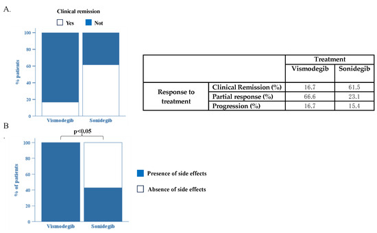(A). Comparison of efficacy of treatment with vismodegib and sonidegib. (B). Comparison of patients who developed side effects during treatment between groups of patients treated with vismodegib and sonidegib. p < 0.05 via Fisher’s exact test.