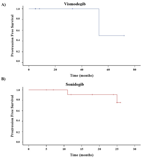 The median of follow-up for patients treated with vismodegib (n = 6) was 20.5 months (5.0–57.75), and, of those, three out of six stopped treatment and three out of six switched to sonidegib. The median of follow-up for patients treated with sonidegib was 21 months (11.75–25), and all patients are still under treatment. It is interesting to note that in the sonidegib group, the median of PFS was not reached; thus, during all the time of surveillance of these patients, more than 50% were free from progression (Figure 2B). On the contrary, it should be recorded that in the vismodegib group (Figure 2A), the Kaplan–Meyer curve showed a median PFS of 53.0 months.