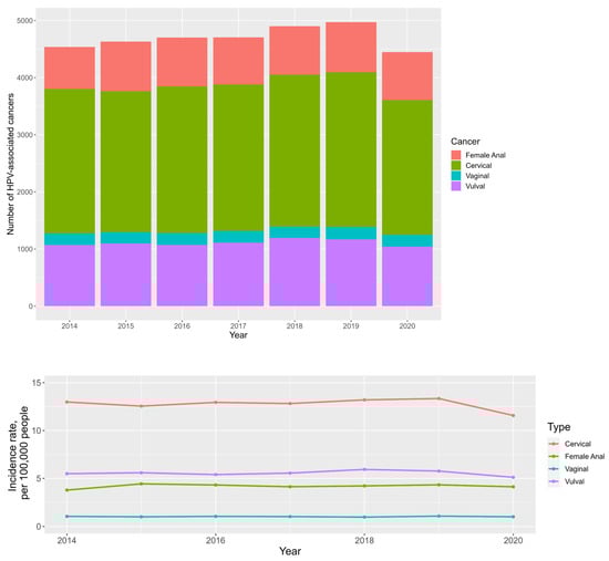 Stacked bar chart looking at total numbers of anogenital cancers between 2014 and 2020 (top). Line graph demonstrating anogenital cancer incidence trends in women over the age of 25 years between 2014 and 2020 (bottom).