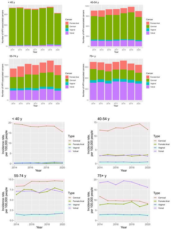 Stacked bar chart looking at the total numbers of anogenital cancers in women between 2014 and 2020, broken down in age groups (top). Line graphs demonstrating age—specific anogenital cancer incidence trends in women between 2014 and 2020 (bottom).
