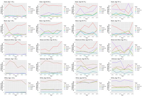 In the 55–74 year age group, the gaps in incidences between cervical, vulval and anal cancer are smaller. Whilst cervical cancer is still the most prevalent cancer in all the ethnicities, in the White ethnicity group, vulval and anal cancer incidences have surpassed that of cervical cancer in 2019 (8.9 and 8.0 vs. 7.6 per 100,000 people, respectively), see Figure 4. In the Asian group, vulval cancer has had an average annual increase of 66.6% with its incidence in 2019 nearing that of cervical cancer (6.3 vs. 6.8 per 100,000 people). Cervical cancer incidence has seen an average annual percentage decrease of −1.7% and −3.7% in Asian and Unknown groups, respectively, and the largest average annual percentage rise was seen in the Mixed group at 22.4%. Cervical, vulval, vaginal and anal cancer median incidences are highest in the Unknown group at 88.1, 64.2, 8.6 and 52.8 per 100,000 people, respectively. Anal cancer incidence has been rising in all ethnicities, with the largest AAPC in the Black ethnicity group at 132.9%.