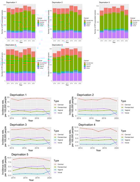 Stacked bar chart looking at the total numbers of anogenital cancers in women between 2014 and 2020, broken down in deprivation quintiles (top). Line graph demonstrating deprivation—specific anogenital cancer incidence trends in women between 2014 and 2020 (bottom).
