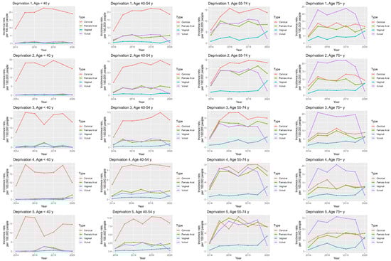 More specifically, the highest median incidence for anal cancer is seen in the deprivation 1 quintile and 75+ y age group at 10.2 per 100,000 people, for cervical cancer in the deprivation 1 quintile and 40–54 y age group at 20.9 per 100,000 people, for vaginal cancer in the deprivation 1 quintile and 75+ y age group at 4.5 per 100,000 people and for vulval cancer in the deprivation 2 quintile and 75+ y age group at 20.3 per 100,000 people; see Table S3 (Supplementary Materials).