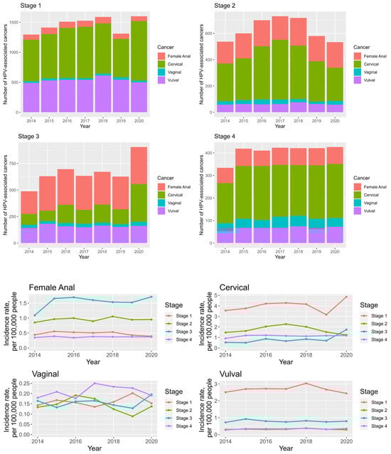 Stacked bar chart looking at the total numbers of anogenital cancers in women between 2014 and 2020, broken down by cancer staging (top). Line graph demonstrating anal, cervical, vulval and vaginal cancer incidence rates for staging between 2014 and 2020 (bottom).