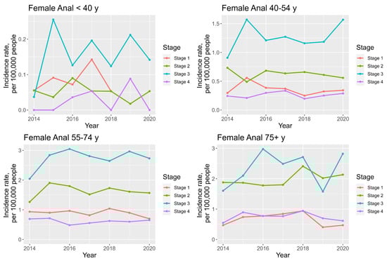 Line charts demonstrating staging and age—specific female anal cancer incidence trends between 2014 and 2020.