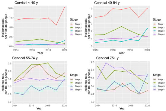 Line charts demonstrating staging and age—specific cervical cancer incidence trends between 2014 and 2020.