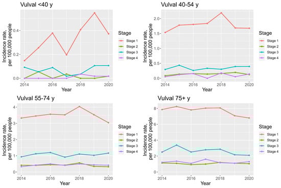 For vulval cancer, stage 1 disease incidence is highest in all age categories, followed by stage 3 incidence, see Table S3 (Supplementary Materials) and Figure 10. The incidence of stage 1 disease is on the rise in the <40 years and 40–54 years age groups and declining in the 55–74 and 75+ years age groups, whilst that of stage 3 has increased in all but the 75+ y group.