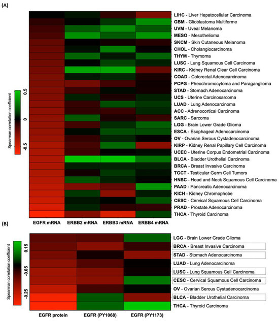 Correlation between RKIP and HER receptor expression in solid tumors—in silico analysis. Using TCGA data available at cBioPortal (www.cbioportal.org, last accessed on 14 Apri 2024), we analyzed the 30 TCGA PanCancer Altlas studies concerning solid tumors, which comprise 10,719 samples, and co-expression plots were generated to determine the correlation level between RKIP (PEBP1) and HER receptor (EGFR, ERBB2, ERBB3, ERBB4) expression. HER and PEBP1 mRNA expression data (RNA Seq V2 RSEM) were used relative to diploid samples, and EGFR protein (Reverse-phase protein array-RPPA). The correlation levels were assessed using Spearman’s correlation coefficient (p). (A) Individual Spearman’s correlation coefficients (Supplementary Materials Table S1) regarding mRNA correlations are graphically represented in the heatmap. (B) Correlation levels between PEBP1 mRNA and EGFR protein, both total protein and the phosphorylated forms at tyrosine 1067 (PY1067) and tyrosine 1173 (PY1173). Spearman correlation coefficients are graphically represented as a heatmap for the 9 tumor types in each the inverse correlation with total protein was significant (Supplementary Materials Table S2). BRCA, STAD, LUSC, CESC, and BLCA are the 5 datasets in which the correlation was maintained at the phosphorylated level. PEBP1 expression was classified as positively (p > 0; dark to green) or negatively (p < 0; dark to red) correlated with HER expression.