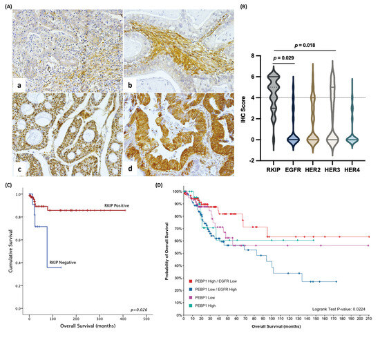 Correlation between RKIP and HER receptor expression in cervical cancer. (A) Immunohistochemistry analysis for RKIP in representative adenocarcinoma tissues of cervical cancer: (a) sample with low RKIP expression in the tumor and positive staining in the stroma; (b) sample showing positive staining in the stroma but with negative RKIP expression in the tumor; (c) sample with high nuclear expression of RKIP; (d) sample showing high cytoplasmatic RKIP expression. All pictures were taken at 200× magnification. (B) Violin plot showing the distribution of IHC scores for RKIP and HER receptors. For correlation analysis between RKIP and HER receptors, we considered the cases with IHC scores > 4: 100/181 for RKIP, 7/176 for EGFR, 23/170 for HER2, 70/166 for HER3, 1/158 for HER4. (C) Kaplan–Meier survival analysis was conducted with positive (red) and negative (blue) RKIP protein expression and its association with overall survival in cervical adenocarcinoma (N = 90). (D) Kaplan–Meier survival analysis was performed at cBioPortal considering patient tumor samples with both RKIP-low and EGFR-high (PEBP1: EXP < 0 and EGFR: EXP > 0; N = 99) or both RKIP-high and EGFR-low (PEBP1: EXP > 0 and EGFR: EXP < 0; N = 107) mRNA expression and patients with only RKIP-low (PEBP1: EXP < 0; N = 71) or RKIP-high (PEBP1: EXP > 0; N = 26) expression. For survival analysis, the log-rank test (p < 0.05) was considered statistically significant.