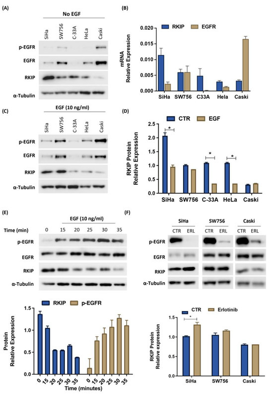 To determine the influence of EGFR signaling on RKIP expression, we started by inducing EGFR phosphorylation by stimulation with EGF. Except for the SW756 and CaSki cell lines, RKIP protein expression significantly decreased upon EGF treatment (Figure 3C,D). Curiously, SW756 and CaSki are the cell lines with the highest EGFR phosphorylation levels at basal conditions, meaning that they are hypothetically under EGFR control, and the quantity or time of EGF treatment was not enough to impact RKIP expression. To test this hypothesis, we treated the SW756 cell line with the same dose of EGF (10 ng/mL), but over time, starting with the standard 15 min and ending before the EGFR turnover of 35 min. In this experiment, we progressively activated EGFR for a longer period, which allowed us to observe a concomitant decrease in RKIP expression, even in an overactivated EGFR cell line (Figure 3E).
