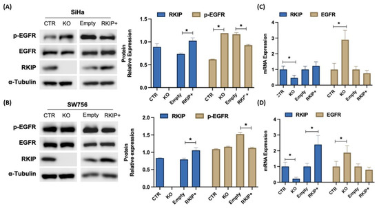 To determine whether RKIP can regulate EGFR, we genetically modulated its expression by in vitro knockout (KO) and plasmid overexpression (RKIP+) in SiHa and SW756 cell lines (Figure 4). It was observed that RKIP KO significantly increased EGFR at the protein level, which was more perceptible in its phosphorylated form, only in the SiHa cell line (Figure 4A,B). At the mRNA level, EGFR increased significantly in both cell lines upon RKIP KO (Figure 4C,D). In contrast, overexpression of RKIP resulted in no significant changes in EGFR mRNA levels, but a significant decrease in its activation levels was observed in both cell lines (Figure 4A,B).