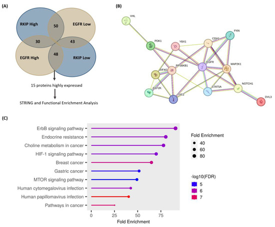 In silico analysis of protein expression signatures from cervical cancer patients with RKIP downregulation and EGFR upregulation. (A) Tumor samples from 48 patients with low RKIP mRNA expression (log RNA Seq V2 RSEM) and high EGFR protein expression (RPPA) were selected in cBioPortal using TCGA CSCC (Firehose legacy). Through enrichment analysis, 15 proteins were found to be highly expressed in this group of patients compared with the following groups of patients: RKIP-low mRNA expression and EGFR-high protein expression (PEBP1:EXP < 0 and EGFR:PROT > 0; N = 48); RKIP-high mRNA expression and EGFR-high protein expression (PEBP1:EXP > 0 and EGFR:PROT > 0; N = 30); RKIP-high mRNA expression and EGFR-low protein expression (PEBP1:EXP > 0 and EGFR:PROT < 0; N = 50); and RKIP-low mRNA and EGFR-low protein expression (PEBP1:EXP < 0 and EGFR:PROT < 0; N = 43). (B) Functional protein association network performed in STRING (https://string-db.org/, last accessed on 14 April 2024), showing a significant interaction within the network (PPI enrichment p-value = 2.22 × 10−16). (C) ShinyGo Lollipop plot results from the functional enrichment analysis showing the top 10 KEEG pathways enriched in the subset of enriched proteins. Enriched pathways were sorted considering the Fold Enrichment; the size of the circles is proportional to the Fold Enrichment, and the color of the bars corresponds to the log10(FDR) values.