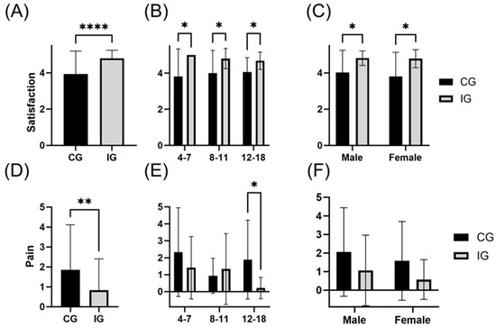 Mean Likert satisfaction scores for CG and IG comparing all patients (A), segregated by age group (B) and gender (C). Mean FPS-R pain score for CG and IG comparing all patients (D), segregated by age group (E) and gender (F). Vertical bars indicate standard deviation.