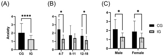 Mean Anxiety STAIC scores for CG and IG comparing all patients (A), segregated by age group (B) and gender (C). Vertical bars indicate standard deviation.