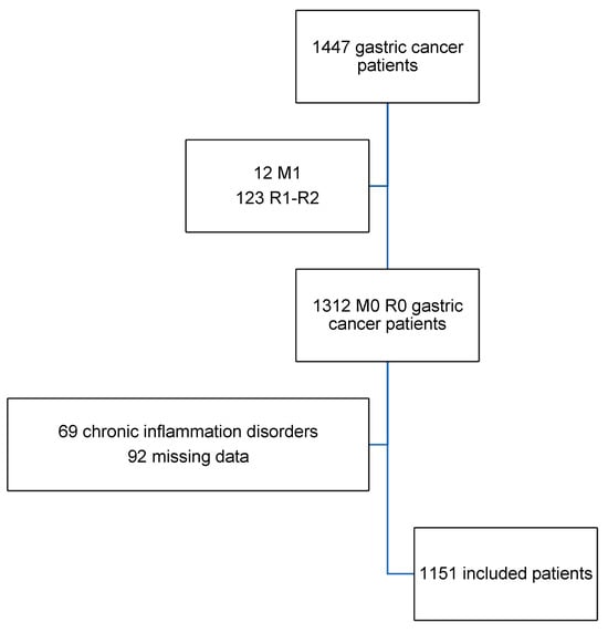 All consecutive patients with primary gastric or esophagogastric junction adenocarcinoma (Siewert 2 or 3) undergoing only gastric resection with curative intent (R0) between January 2014 and December 2018 were selected for the study. The data collection and the statistical analysis were started in October 2021. Exclusion criteria were: (1) age under 18 years; (2) chronic inflammatory disease: obesity (body mass index > 40 kg/m2), liver cirrhosis, chronic pancreatitis, or inflammatory bowel disease; (3) autoimmune or haematological disease; (4) R1 and R2 resections; (5) intraoperative finding of peritoneal metastases or liver metastasis; (6) palliative surgery; and (7) missing follow-up or preoperative or postoperative white blood cell count data.