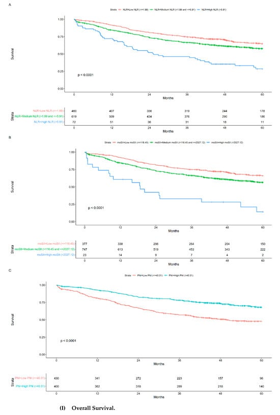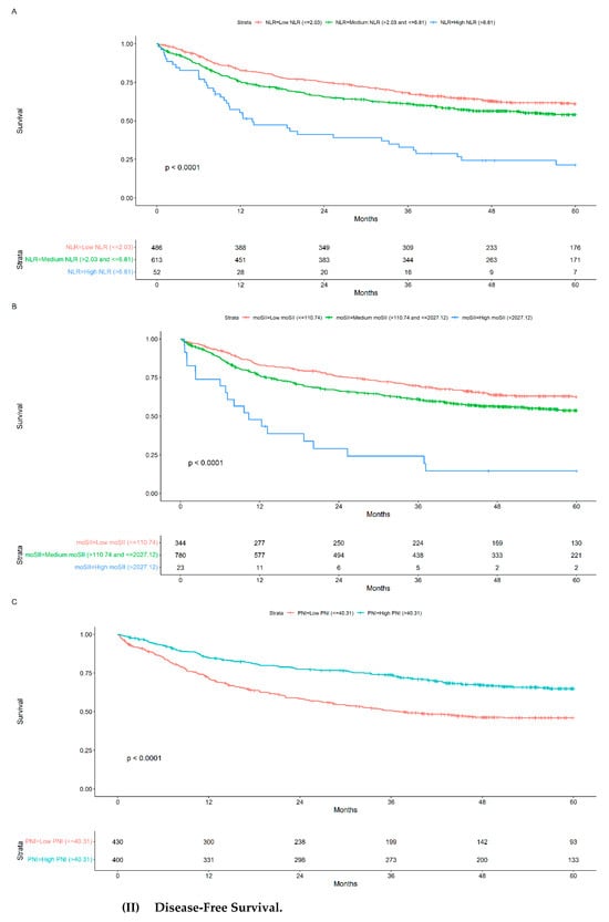 Kaplan–Meier curves for NLR (A), moSII (B), and PNI (C) categories in (I,II).