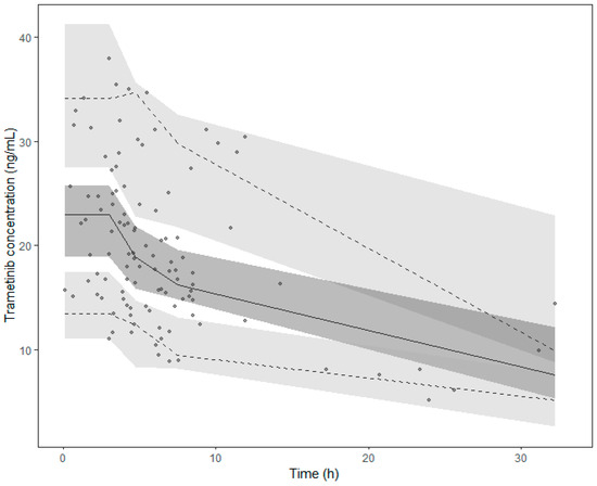 Data were collected during the OpTAT study [17]. Patients included adults receiving trametinib for the treatment of their solid tumour (e.g., melanoma, ovarian cancer, breast cancer). Blood samples were collected from patients during their regular medical visits, with a maximum of eight samples taken per patient. To better characterize the PK profile, two patients consented to provide extensive samples, with eight concentrations measured between 0 and 24 h after drug intake. Trametinib plasma levels’ quantification was performed using liquid chromatography coupled with tandem mass spectrometry using an adaptation of the multiplex method developed at the Lausanne University Hospital [41]. The lower limit of quantification and detection for trametinib was 1 and 0.5 ng/mL, respectively.
