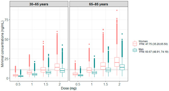 Figure 3 presents the results of the 100 model-based simulations performed on 4000 patients, with 1000 patients per age group (<65 years or ≥65 years) and sex. Table 3 summarizes the percentage of patients below or within the therapeutic target, i.e., Cmin ≥ 10.6 ng/mL. These results show that men generally have lower concentrations than women and require higher doses to be within the therapeutic target. For older patients, a lower dose was found to be sufficient to reach the therapeutic target.