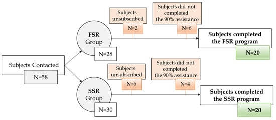 Of all the women who showed interest, a series of physical fitness tests were carried out and, with equal anthropometric parameters (weight, height, BMI) and test results, one was assigned to one group (FSR or SSR), and the one with the most similar results was assigned to the other group (SSR or FSR). The sample was divided into two training groups with similar measurements (Table 2):
