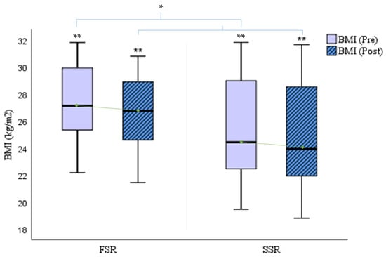 The following figures compare the changes produced according to the different training protocols. Focusing on body composition, Figure 3 shows a slight improvement in both groups (FSR: Δpre-post BMI = −0.73/SSR: Δpre-post BMI = −0.67; p = 0.000), although it is slightly higher in the FSR group.