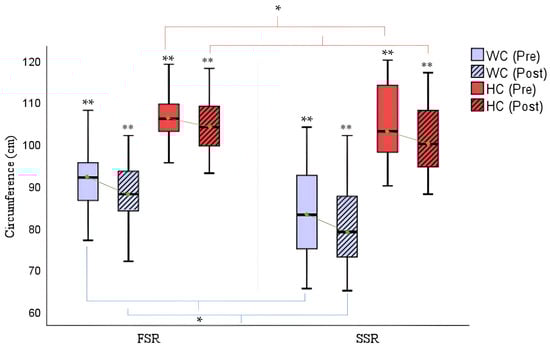 In Figure 4, statistically significant improvements were detected in both waist circumference (FSR: Δpre-post waist circumference = −2.83/SSR: Δpre-post waist circumference = −3.66; p = 0.000) and hip circumference (FSR: Δpre-post hip circumference = −2.2/SSR: Δpre-post hip circumference = −2.88; p = 0.000), although the values were slightly higher in the SSR group.