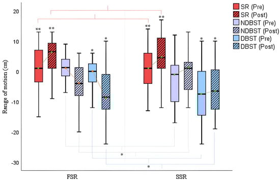 Regarding the parameters associated with flexibility, Figure 5 shows significant improvements in both groups for the general flexibility variable with the sit-and-reach test (FSR: Δpre-post sit and reach = +3.53; p = 0.027/SSR: Δpre-post sit and reach = +4.4/p = 0.027). An analysis of the values obtained in the back scratch test (BST) shows a significant worsening in upper extremity flexibility in the FSR rowers in both the dominant arm (FSR: Δpre-post dominant BST = −5.55; p = 0.02) and the non-dominant arm, although this was not significant (FSR: Δpre-post non-dominant BST = −3.81; p = 0.258). Conversely, data from subjects participating in the SSR training program showed improvements in both the dominant arm (SSR: Δpre-post dominant BST = +1.75; p = 0.02) and the non-dominant arm (SSR: Δpre-post non-dominant BST = +1.72; p = 0.258).