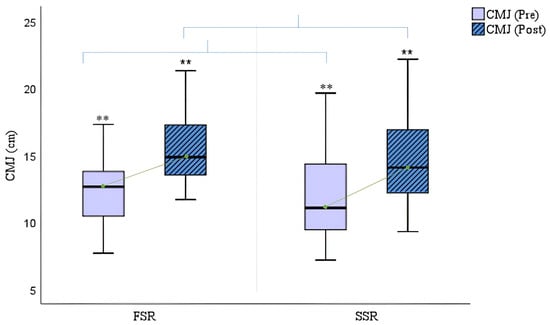 Counter movement jump (CMJ) (cm) pre- and post- rowing training. FSR = Fixed-Seat Rowing; SSR = Sliding-Seat Rowing. ** p < 0.001. No statistically significant differences in comparison between groups (Student’s t-test for independent groups).