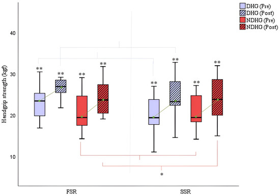 Figure 7 illustrates the results of the handgrip test with significant improvements in both training groups, both for the dominant arm (FSR: Δpre-post dominant handgrip = +4.13/SSR: Δpre-post dominant handgrip = +4.34; p = 0.000) and the non-dominant arm (FSR: Δpre-post non-dominant handgrip = +3.67/SSR: Δpre-post non-dominant handgrip = +3.32; p = 0.000).