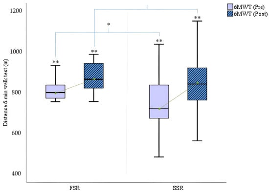 A comparison of the distance in the 6 min walk test (m) pre- and post-rowing training. 6MWT = 6 min walk test; FSR = fixed-seat rowing; SSR = sliding-seat rowing. * p < 0.05; ** p < 0.001.