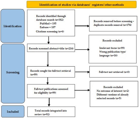 After this search, we obtained 195 results in PubMed and 187 results in Embase. An additional six records were identified via reference screening. All records were written between 1997 and 2024. After duplicate record removal, we obtained 214 records and then screened the titles and abstracts for eligibility; 115 records were excluded due to irrelevant focus or not meeting inclusion criteria. Full-text articles were retrieved for 99 records, and out of those, 92 were integrated into our review according to relevance to the discussed subject (Figure 1).