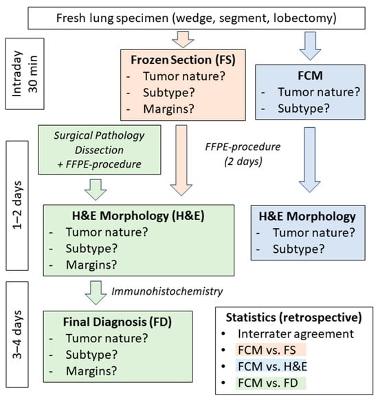 All examinations for the study took place after the completion of routine examinations and had no impact on the clinical care of the patients (Figure 1). To evaluate the performance of FCM examinations, the diagnoses were compared with the results of frozen sections (FS) and conventional microscopy of H&E-stained slides of FFPE-processed material (H&E). The agreements of the individual methods with the final diagnosis (FD) were evaluated. The digital FCM scans were evaluated intraoperatively by a senior pathologist from the tumor center (UT). A second senior pathologist (BT) with a specialization in pulmonary pathology reevaluated the FCM scans in a blinded manner after all routine examinations had been completed. Additionally, the H&E-stained paraffin sections of the FCM materials were assessed in a similar manner by another experienced pathologist (MK) from the tumor center in a blinded fashion. The classification of the sections/scans was carried out according to a standardized schema with predefined diagnostic categories, which were later translated into nominal scales for subsequent statistical analysis. Initially, the nature of the lesions examined was grouped into two categories: 1—neoplastic; 2—reactive. In the second step, the nature of the neoplastic tumors was classified into three categories: 1—benign; 2—malignant; 3—uncertain. Additional free-text diagnoses were to be provided for the categories of benign tumors and uncertain lesions. Malignant tumors were further classified into four groups: 1—squamous cell carcinomas, 2—adenocarcinomas, 3—neuroendocrine tumors, and 4—other/special entities. The documented results of the frozen sections as well as the final diagnoses (immunohistological subtypes) were retrospectively transferred into the same matrix by another pathologist (FH).